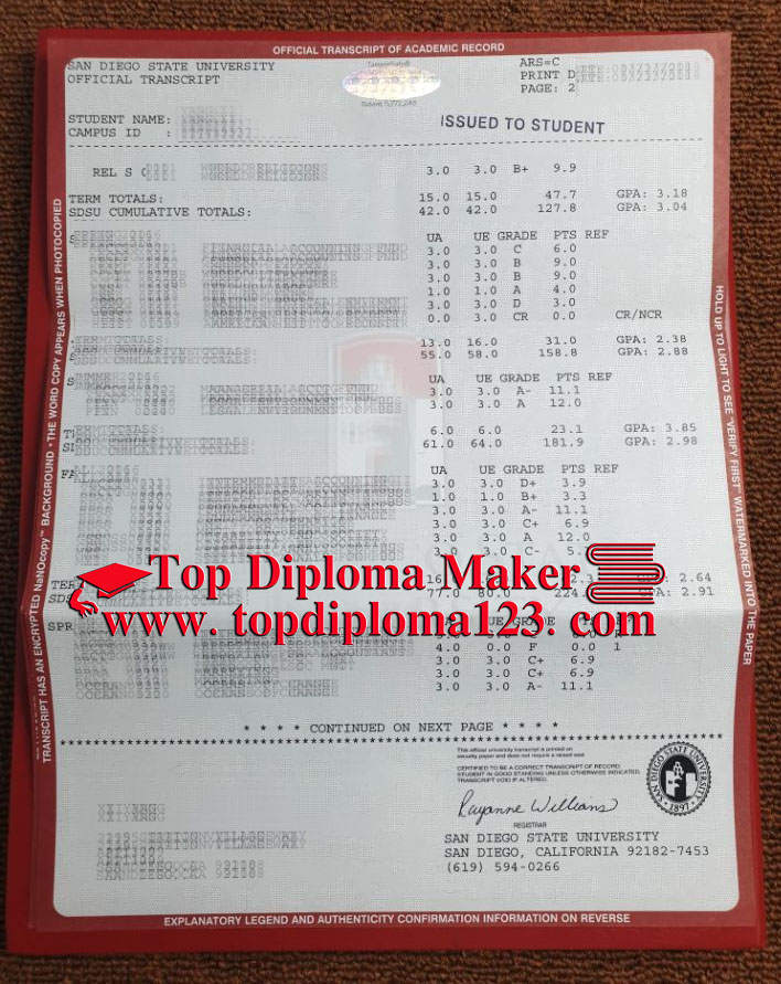 San Diego State University (SDSU). SDSU fake transcript sample, buy fake San Diego State University transcript online, buy diploma, buy fake degree, buy fake SDSU certificate, The school was founded in 1897 in San Diego, Southern California. The school is a comprehensive university with all-round development, and also the oldest university in San Diego area. It is a member of 23 California State University System universities. San Diego's business school is one of the five largest business schools in the United States. Its accounting school is the first accounting major established in California, and also one of the first schools in the United States to obtain AACSB certification, the highest certification institution of the American business school system. At the same time, San Diego State University School of accounting is one of the first colleges in California to pass the CPA exam. get a fake degree, fake high school transcript, sending fake transcripts to college, buy a college diploma online, fake certificate online, fake college transcripts with sealed envelope, cheap fake high school transcripts, high quality fake college diplomas, San Diego State University ranks 127th in the U.S. university rankings in 2019.